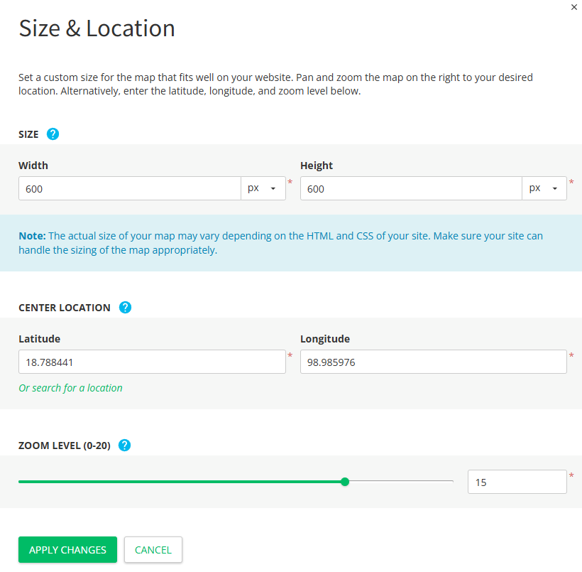 위에서 지도의 위치를 검색했던 Size&Location에 다시 돌아가보면