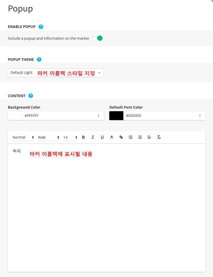만약 마커의 이름이 계속 떠있기를 바란다면 마커 밑의 말풍선처럼 생긴 아이콘을 클릭해준다.